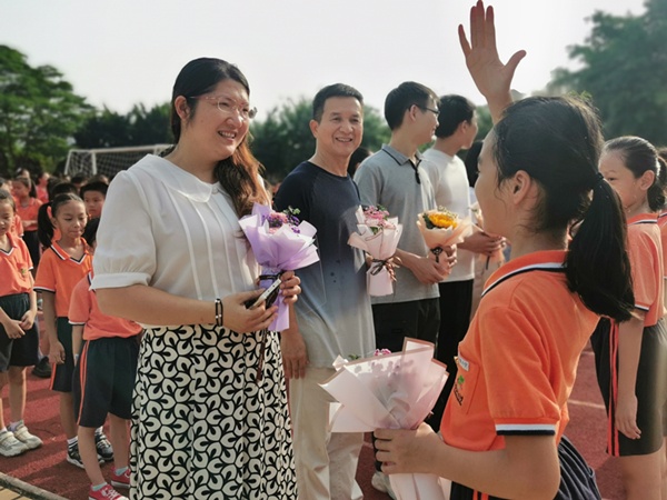 9月10日清晨,開發(fā)區(qū)中心小學(xué)在升旗臺前舉行感懷師恩的活動。莊嚴(yán)肅穆的升旗儀式之后,少先隊員代表配樂朗誦《感恩的心》,深情獻(xiàn)唱,致敬園丁。在《每當(dāng)我走過老師窗前》優(yōu)美抒情的旋律中,一個個佩戴著紅領(lǐng)巾的少先隊員們,有序地向全體教師獻(xiàn)花,致以老師真誠的節(jié)日祝福。陽光下,閃耀著的不僅是高高飄揚的紅旗,更有老師和學(xué)生那一張張喜悅的笑臉。