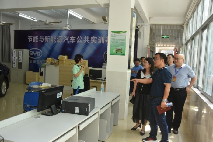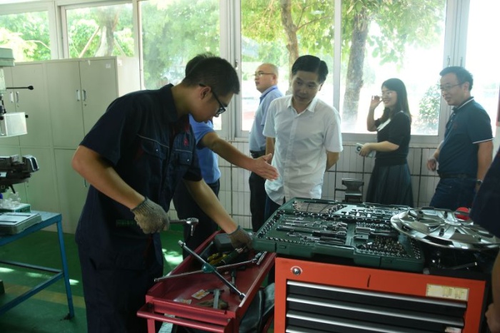 考察團首先走進學(xué)校汽車技術(shù)部的實訓(xùn)場室,觀摩師生上課實操,與師生交流有關(guān)于專業(yè)教學(xué)的設(shè)施設(shè)備、課程內(nèi)容、考核標(biāo)準等具體內(nèi)容;參觀學(xué)校與企業(yè)合作的汽車維修中心,詢問校企合作的運行機制、運作流程。考察團還走進節(jié)能與興能源汽車公共實訓(xùn)基地,了解基地內(nèi)環(huán)境、人員和設(shè)備等情況,感受正在建設(shè)廣東省雙高專業(yè)的新能源汽車維修專業(yè)群的新進展。
