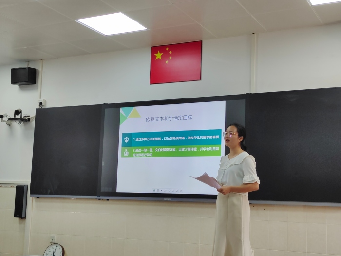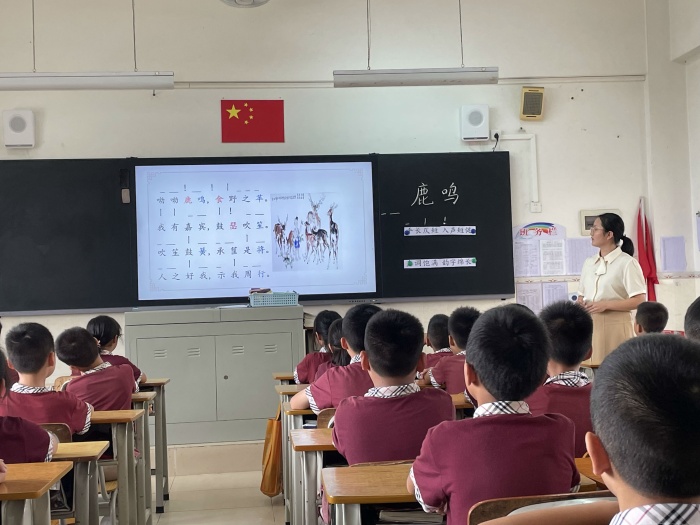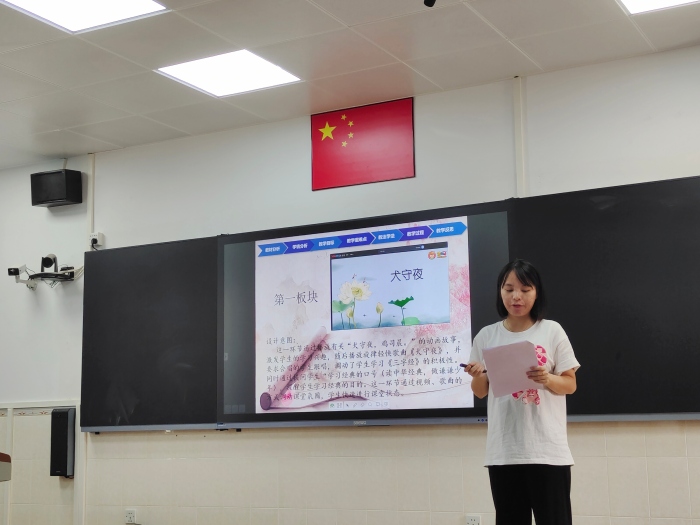 17日上午,決賽以說課的方式在錄播室進行。一至六年級每個備課組經(jīng)過初賽推薦出來的優(yōu)秀選手逐一進行了說課。她們從教材解讀、重難點突破、教學理念等多個維度進行了闡述。在說課中還通過吟誦、圖表、講故事、游戲互動等形式展示了生動的課堂教學環(huán)節(jié)。