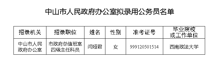 根據(jù)《中華人民共和國公務員法》《公務員錄用規(guī)定》《廣東省公務員錄用辦法》等有關規(guī)定,按照《廣東省2021年考試錄用公務員工作實施方案》要求,經(jīng)筆試、面試、體檢和考察等程序,擬錄用閆婭君同志為我辦公務員(情況附后)。