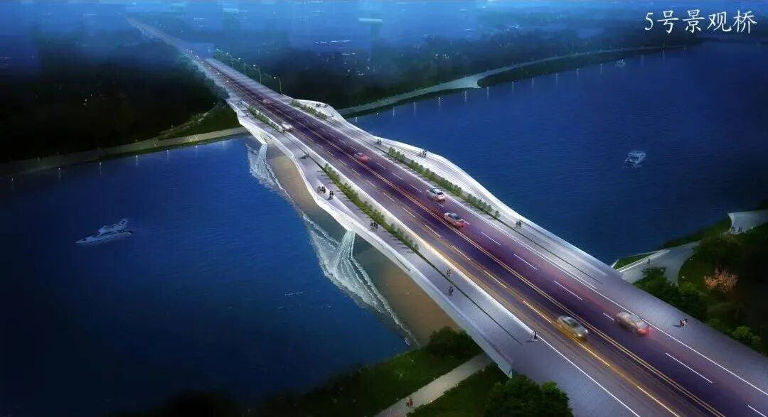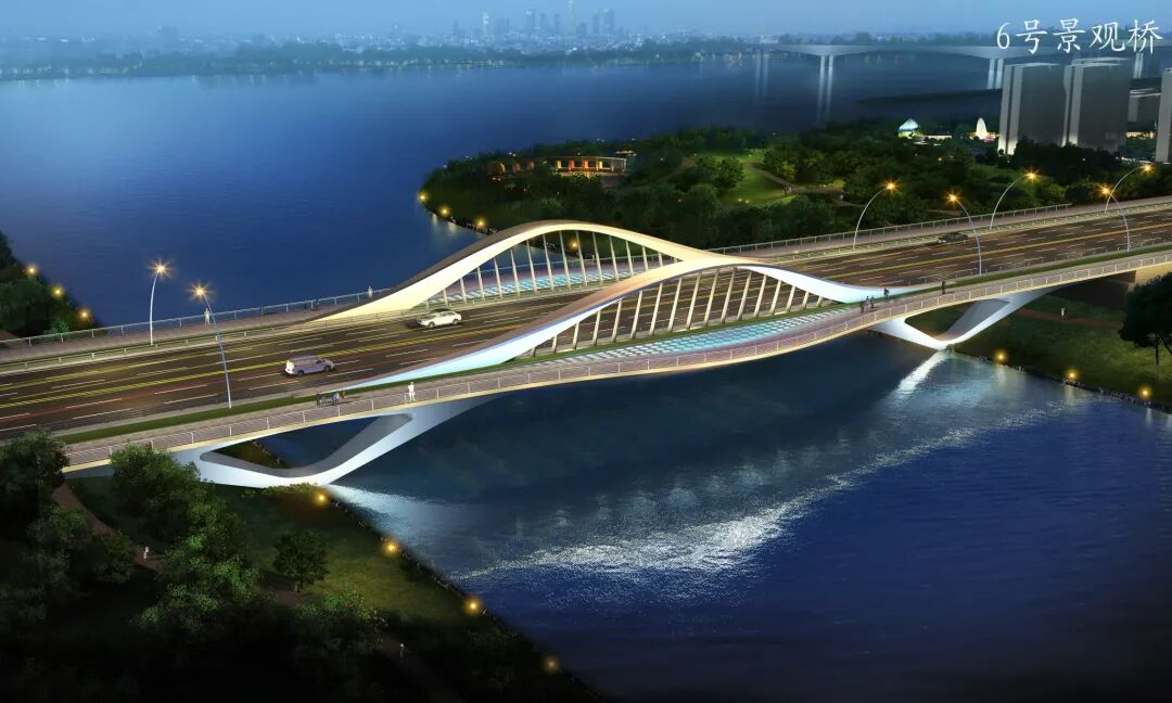 “城融”橋梁分布在茅龍水道沿南、北兩端,采用建筑高度較低的梁橋形式,能與周邊密集的高層建筑更好地融為一體。兩座橋梁南北呼應(yīng),剛?cè)嵯酀g蘊含著和諧處世的理念。
